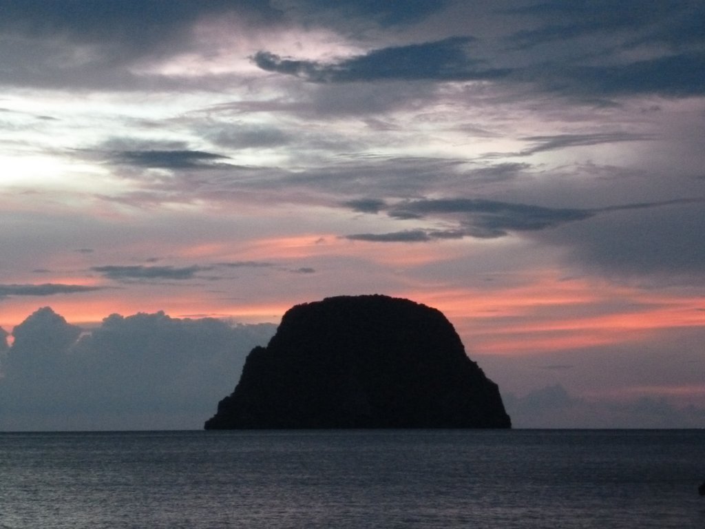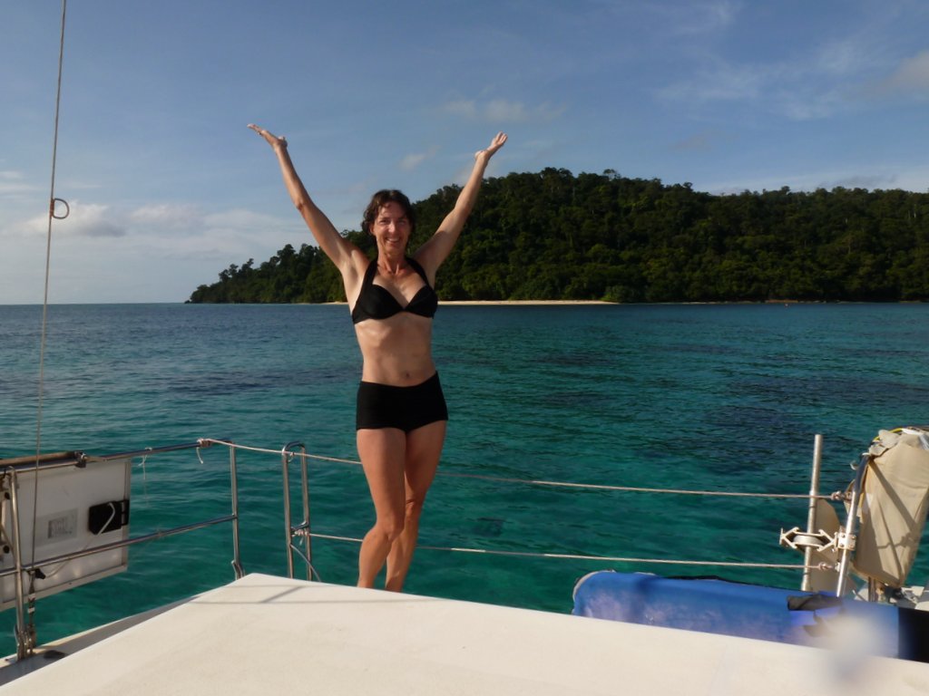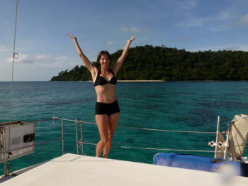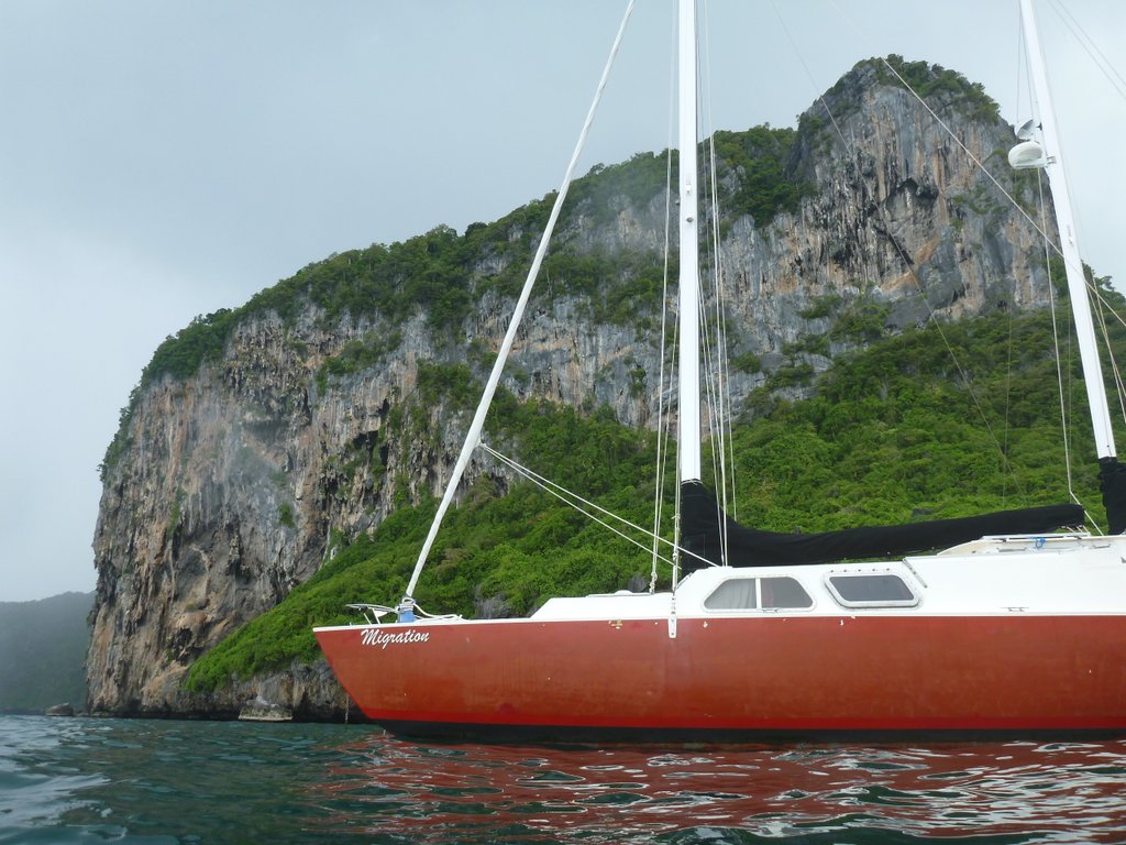 But why are we here when we said we were going to sail overnight to Phuket? No, there's no problem, thankfully; just a change of plans. When we left Langkawi, we fully intended to keep going until we reached Phuket. We had some good sailing & a fair bit of motoring, but then we were within reach of an island named Koh Rok (there are lots of islands off the west coast of Thailand) that had been recommended to us, & our friends Gloria & Michael of Paikea Mist were there, so we decided to stop for the night. Another reason is because we realized it was our wedding anniversary, so that was another good excuse to stop.