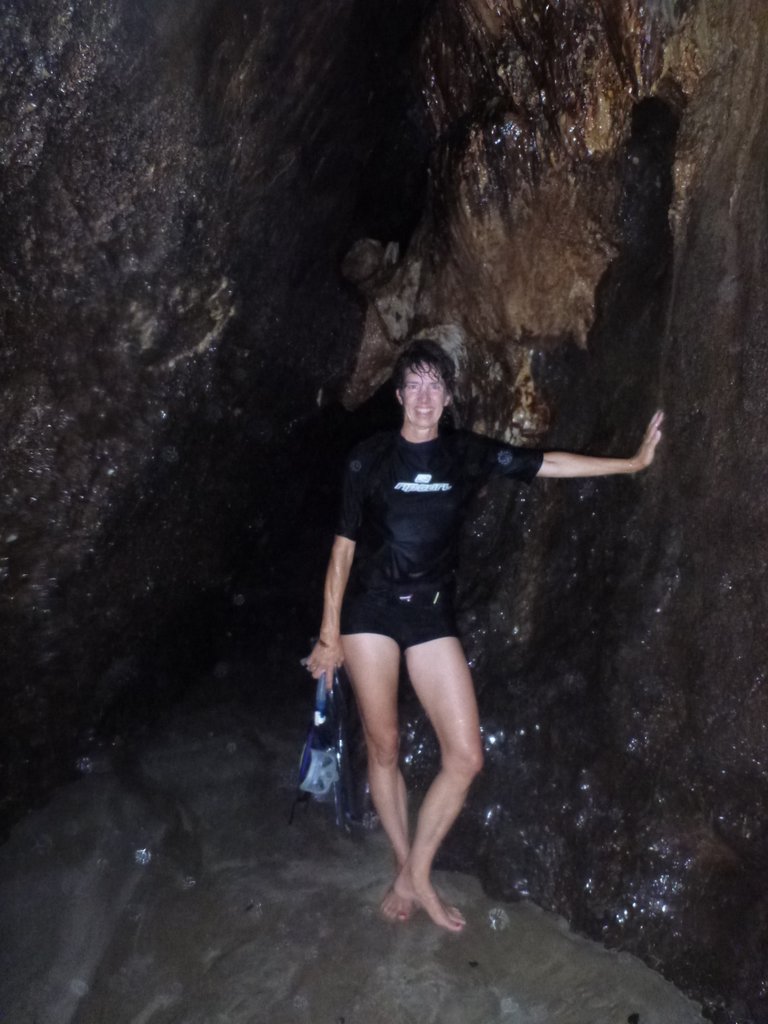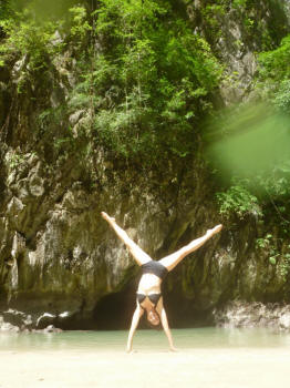 25 years ago. There are small islands off in the distance, fishing float flags adding color to the scene, & very foreign-looking fishing boats all around. We're only about 3 miles from the Thai mainland, so there are tour boats with dozens of Asian tourists & a few “farang” all decked out in fluorescent lifejackets. There were several groups of these at the cave when BB & I swam over to check it out, so we waited until the noisy bunch were gone & then had the place to ourselves. It's aptly named the Emerald Cave because the water inside reflects a very green light - rather eerie, but very beautiful. There were several tunnels to explore & one of those tunnels led to a small private grotto with steep vine-covered cliffs draped down to a lovely little beach. Simply awesome. That grotto could only be reached by swimming through the cave, & we had it all to ourselves for a good 20 minutes before the next group of tourists invaded. I did lots of cartwheels, happy to be in such a beautiful place.