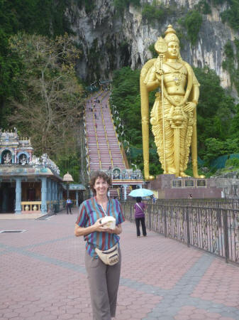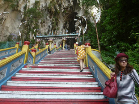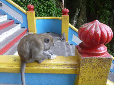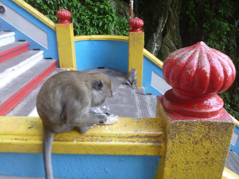 Hang talked non-stop on the ride while Ang slept. We stayed together while exploring Batu Caves. I offered to buy them ice cream but instead Hang bought me a fresh coconut. We took pics in front of the giant golden statue at the entrance to the big cave. The statue of a Hindu God is probably 50' tall. Really something. The steps to the cave entrance were very steep & there was much discussion about whether men would be able to see up their short dresses, but finally they proceeded. They were dressed like typical young Asian girls in little-girl sundresses & completely impractical flats. Hang had a big handbag, but carried her iPad separately for some reason. Ang had only a plastic bag which was an immediate attraction for the monkeys, which were everywhere & were quite aggressive. There were signs warning people to not carry food in that area, & although Ang didn't have food, she had a bottle of water & a nondescript box in the bag. These were visible to the monkeys, one of which attacked the bag before we had gone 10 steps. Ang shrieked & tugged at the bag, which ripped in the monkey's grasp. Other tourists stopped to watch. Ang flailed helplessly, so I took the initiative to swat the monkey away, at first using my hand, but when the monkey bared his teeth at me, I used the sole of my shoe instead. He soon gave up & Hang hastily stuffed the attractants into her big handbag, so there were no further incidents. Ang was too shaken to thank me for saving her from the evil monkey.