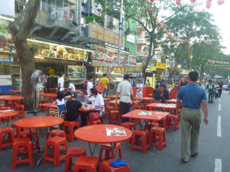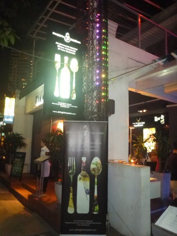 I was surprised how many people were now at Sentral Station - rush hour. I transferred to the city monorail, which was just like a ride at Disneyland. Big windows with passing views of temples, fancy shops, outdoor food stalls, & even a nice view of the needle & the Petronus Towers. I got off at Bukit Bintang, the area where I had found so many hotels online, but I chose not to stay there cuz I thought it'd be too touristy. And it was, a bit, but there was a big night market being set up all along Jalan Alor, which nearly tempted me from my intended destination, especially since it proved difficult to find. I had seen a review in the Malaysia Airlines onboard magazine about a restaurant where they serve the meal entirely in the dark & I was intrigued, but the review only gave the street name, not the entire address. Amazingly, I was right across the street from it when I asked at the Radius International Hotel. It was such a new place that they didn’t know of it, but the article had provided a phone number, so they kindly called for me. It turns out the name of the restaurant is actually ‘Dining In the Dark’, which I thought was the heading of the review, not the restaurant name!
