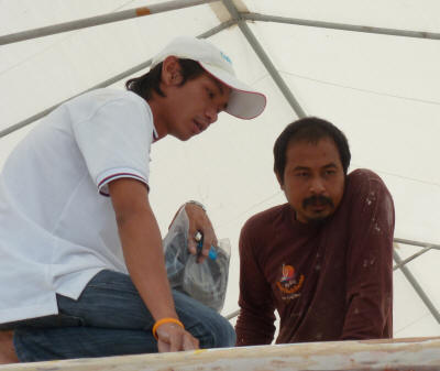 We hired Nhoon based on a glowing recommendation from some friends who had work done the previous year. Though some of his work was excellent, much of it was infuriatingly poor. Of course, like all contractors, he does little of the work himself and has employees doing nearly everything. They spoke no English and we were constantly forced to monitor their work. Interior painting was of astonishingly poor quality. We ended up with areas looking worse than before they were painted. On some of our floorboards, the paint started to peel in just a few days. We were able to peel the new paint off the floorboard in a single sheet. Beneath it was was the original paint unsanded and unwashed -- dirt from our feet still visible. One disastrous experience involved our American maple batten headliner. Nhoon took a few pieces (the ones around the hatches) to his shop to varnish because they were water damaged. Six 2.2 meter battens were not returned and he denied he had them. Months of haggling led us to seek out his shop (actually that part was a fun adventure). With the help of a Thai friend, we spoke with his wife who later found the pieces in a dusty loft. Nhoon returned 5 and 1/2 pieces: one piece having been recently broken (the break was clean while the rest of the pieces were covered in dust). Perhaps it was an accident. Perhaps it was out of spite. It is hard to say as the Asian concept of 'saving face' is difficult for Westerners to understand. These are just a few examples of the many frustrations we experienced.