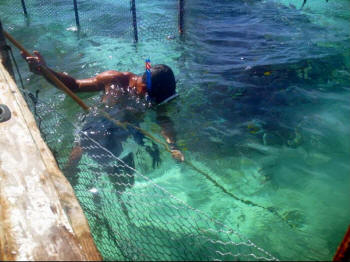One day, we accompanied Gaston and Philippe (Valentine's step-father) to the fish trap. This is a rebar and chicken wire maze constructed where the current flows over the reef. Fish are trapped inside and easily gathered in large chicken wire scoops.